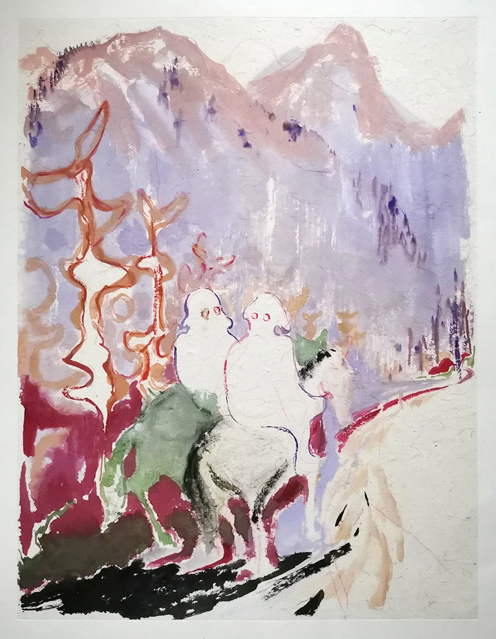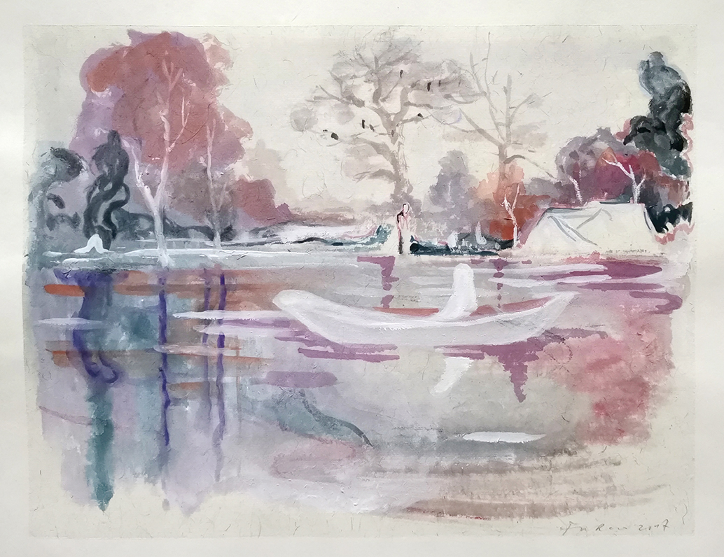 Die Bildwelten von Rao Fu sind geprägt von mystischen Ereignissen, eingebettet in oft düstere Räume und Landschaften. Fabelwesen und geisterhafte, oft nur silhouettenhaft dargestellte, Protagonisten sind in verschiedene Aktionen eingebunden. Durch Ihre Körperhaltung, die Vergesellschaftung und das Umfeld werden aus den schemenhaft dargestellten Situationen rätselhafte Erzählungen, welche aus einem dystopischen Alptraum einer Freizeitsituation heraus gegriffen zu sein scheinen. Der gemeinsame Ausritt in den Wald, der Familienausflug mit Boot auf dem See, Angeln bei Nacht… viele Symbole prägen dabei die Lesbarkeit der Erzählungen – der Wald, das Boot, Wasser und Pferde – vieles deutet auf das Ergründen des Unterbewussten hin, auf einen transzendentalen Zustand zwischen Leben und Tod, es finden sich Bezüge zu Märchen, Sagen und Legenden, zu Waldgeistern, Dämonen, Feen, Hexen, Riesen und Zwergen. Auch die Farbigkeit, gleicht einem psychedelischem Zustand, gefangen zwischen Fantasie und Wirklichkeit.