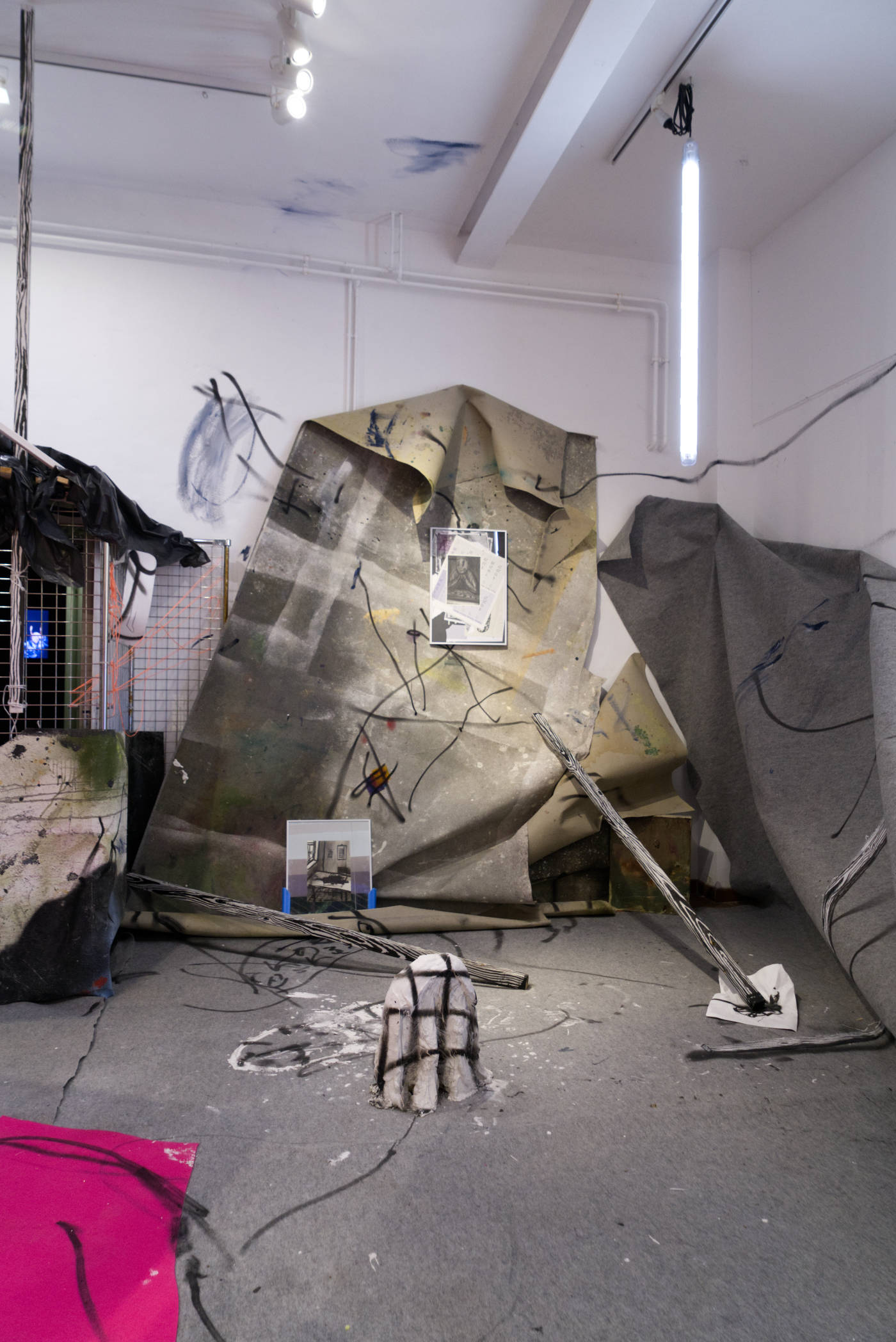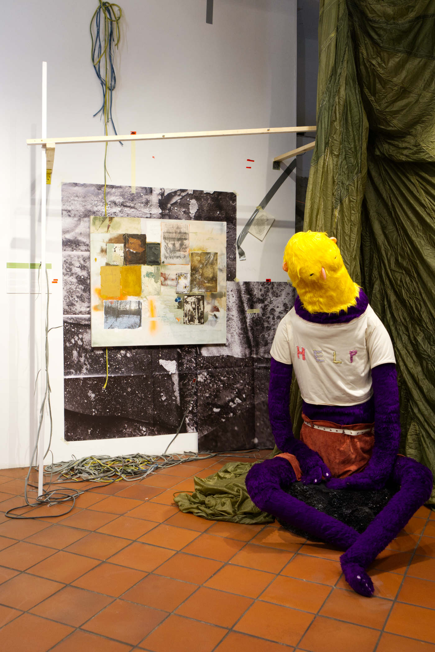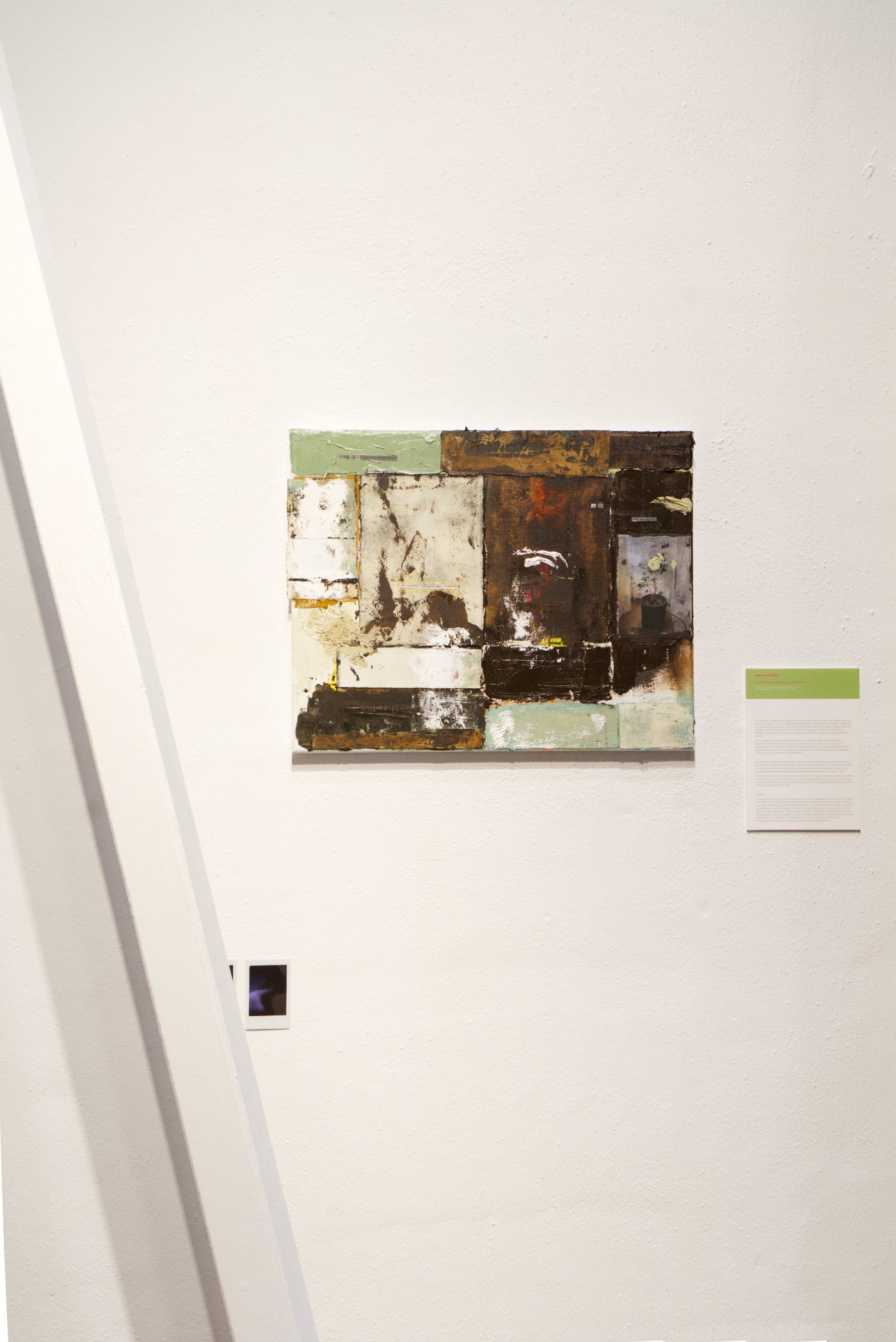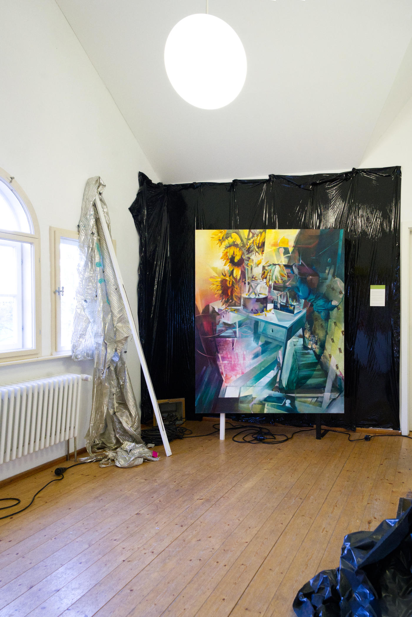 Michal Schmidt aus Erfurt zeigt mit der großformatigen Malerei Polster gekippt 2 ein Bild innerer Instabilität, das zugleich eine Entfremdung von Natur und Umgebung anklingen lässt. Der in Weimar lebende Stefan Schiek