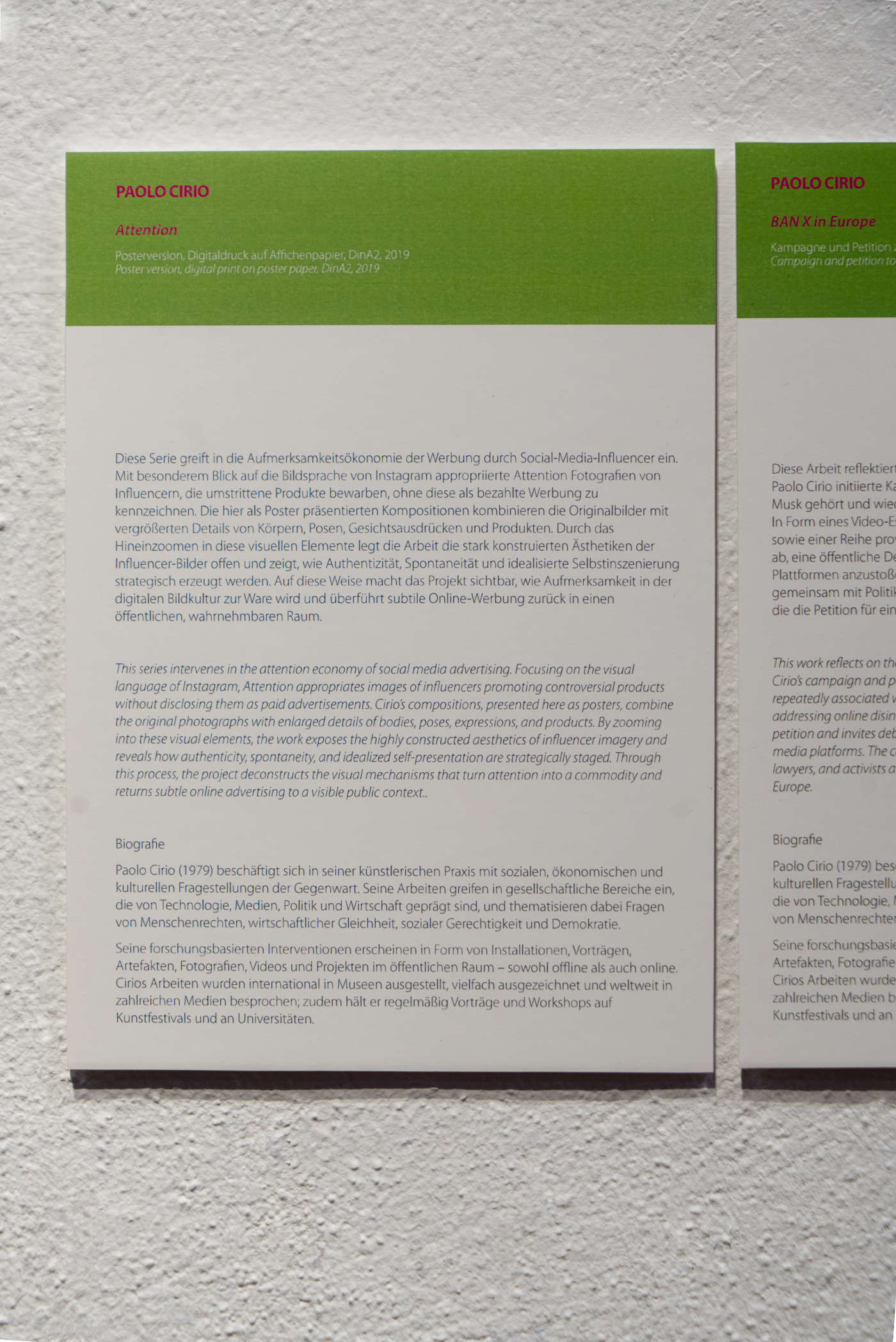 Der italienische Medienkünstler Paolo Cirio, der überwiegend in New York lebt und arbeitet, ruft mit seinem Projekt Ban X from EU dazu auf, die Plattform X aus Europa zu verbannen, und interveniert mit der Arbeit Attention