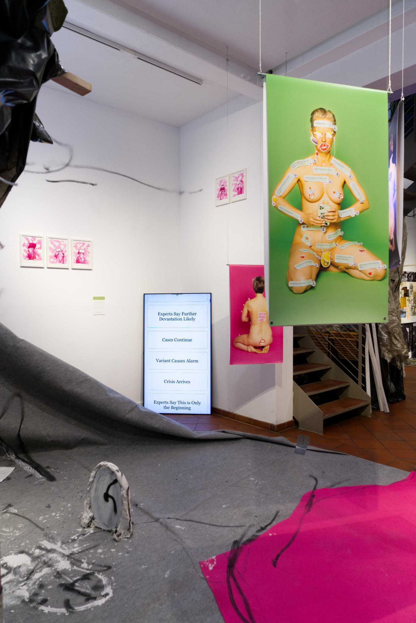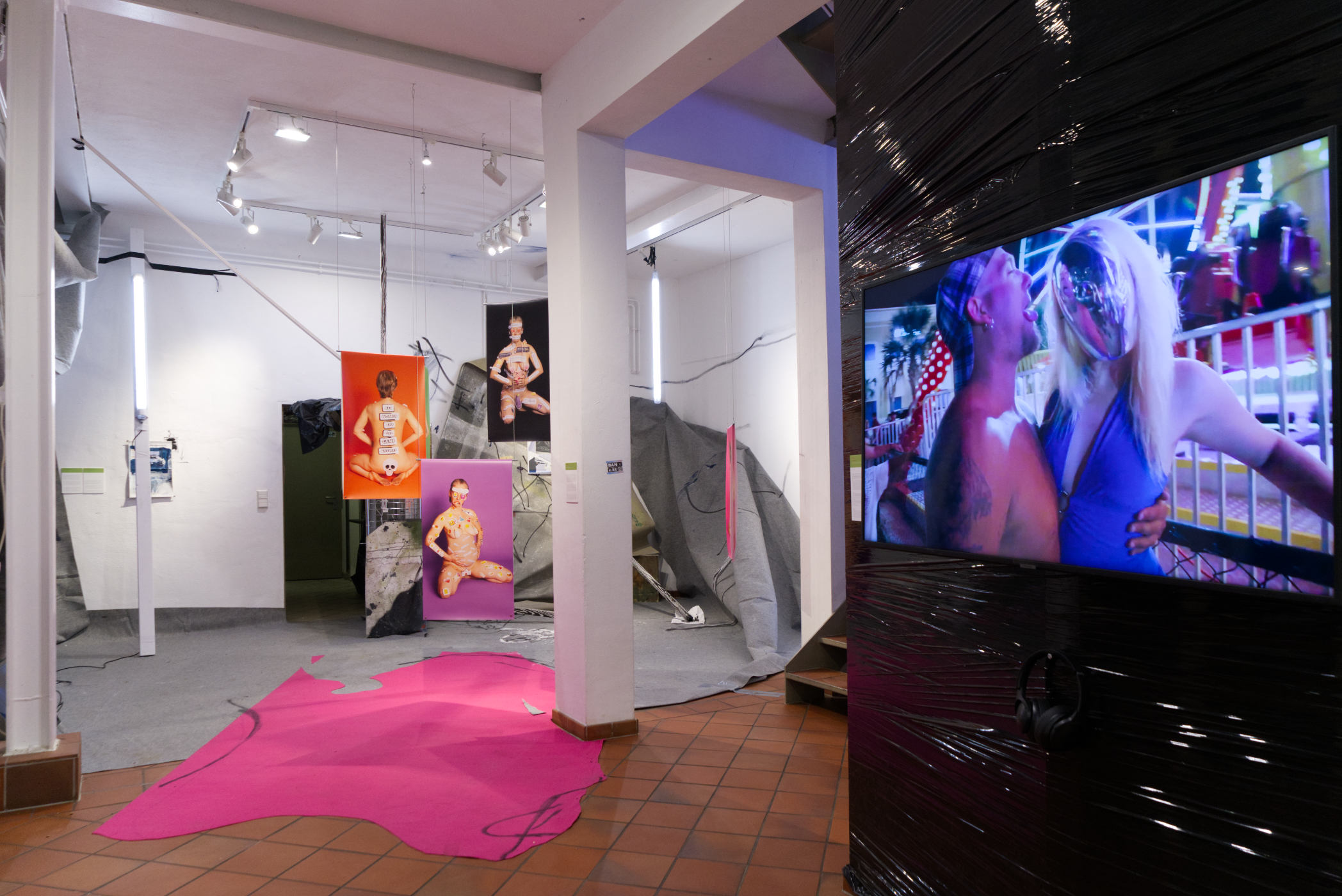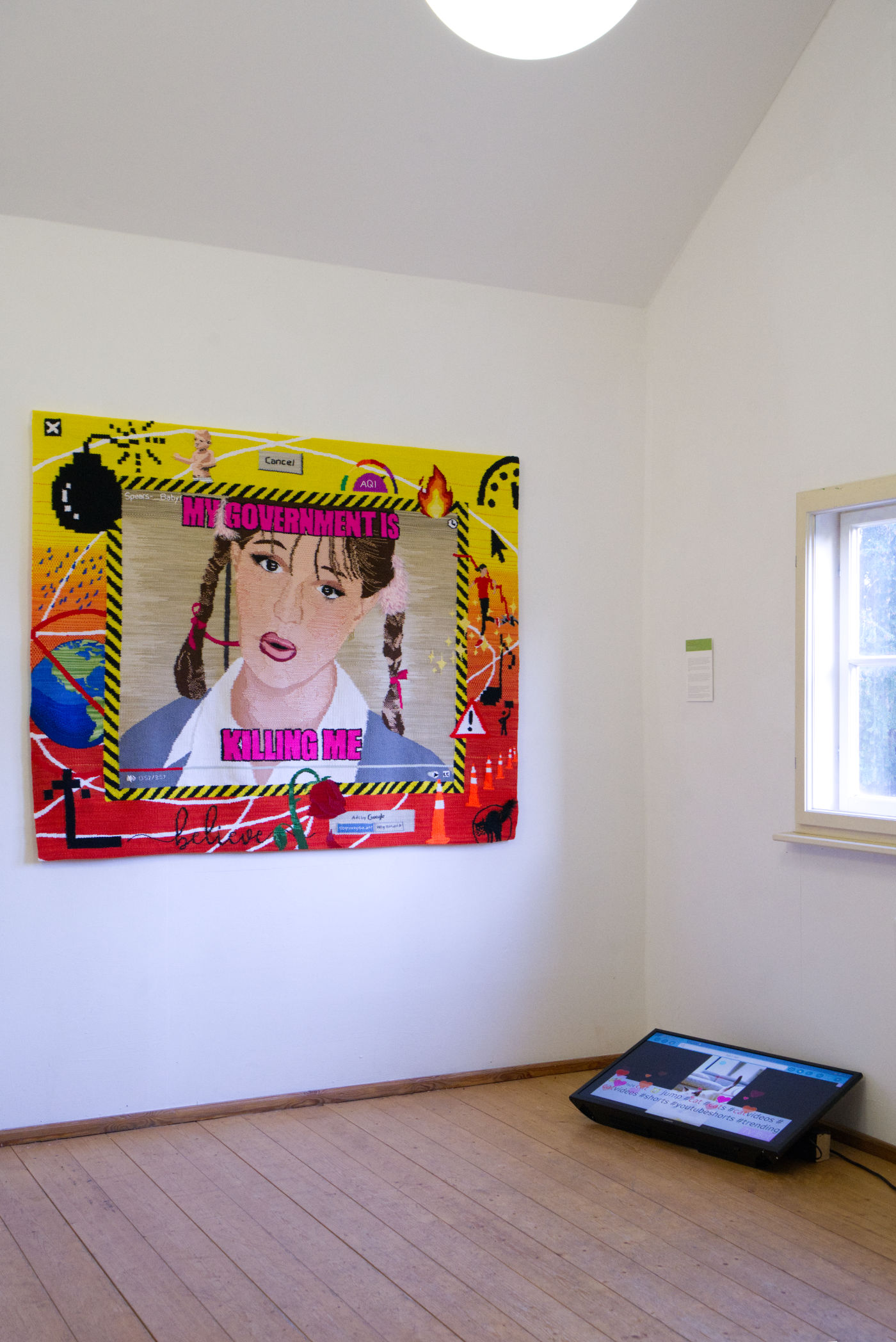 Kayla Mattes aus Los Angeles verbindet in ihrer großformatigen Webarbeit Baby One More Time Meme-Kultur, Popreferenzen und sozialkritische Kommentare zu komplexen Bildteppichen unserer digitalen Gegenwart. Signe Pierce präsentiert ihren ikonischen Kurzfilm American Reflexxx (2013), der gesellschaftlich verankerte Aggression und digitale Selbstinszenierung untersucht. Theresa Rothe aus Leipzig bringt mit Confusing Bunch