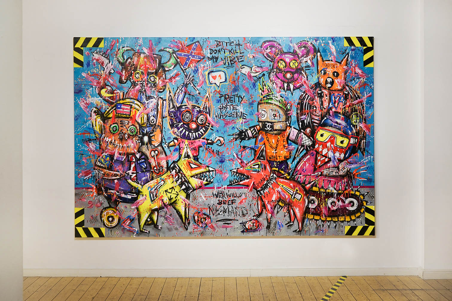 Mit seiner Ausstellung HOME OVAL OFFICE katapultiert Marc Jung uns in die absolute Gegenwart. Er beschäftigt sich mit dem Ansturm auf das Washingtoner Kapitol genauso wie mit unseren seelischen und körperlichen Abgründen. Davon geben seine Titel ein eindrucksvolles Zeugnis ab: Keine Zeit zu sterben, Nasenscheidewand weggefressen oder This is not a lovesong erzählen von einer Gesellschaft zwischen Turbokapitalismus und Einsamkeit, zwischen Hyper Effektivität und Außenseitertum, zwischen Sucht und Sehnsucht. Seine Bilder zeigen Ikonen der Popkultur welche sich im Wandel und in der Auflösung befinden.